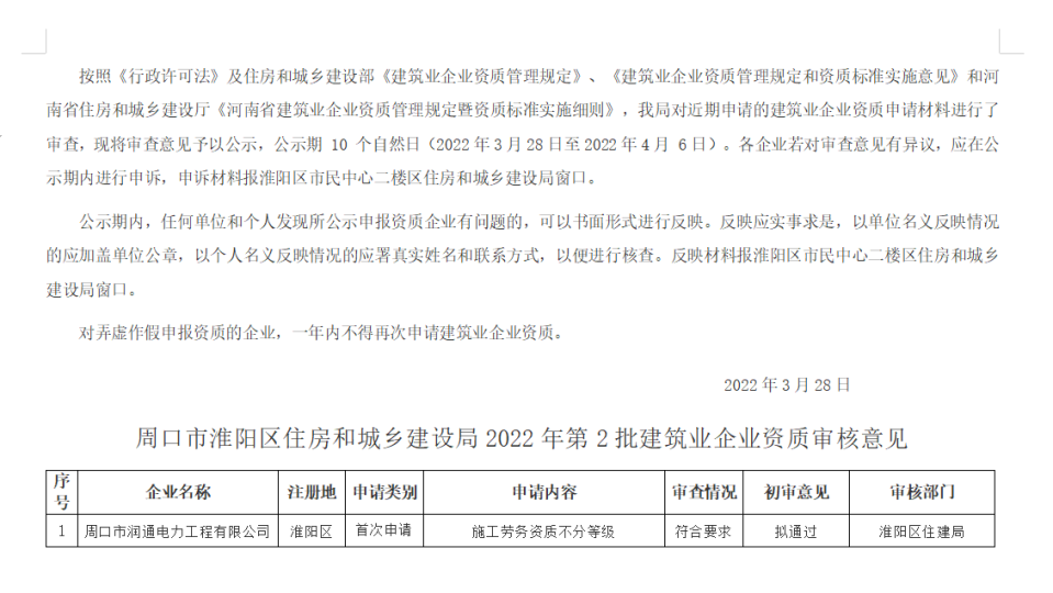 周口市淮阳区住房和城乡建设局2022年第2批建筑业企业资质审核意见