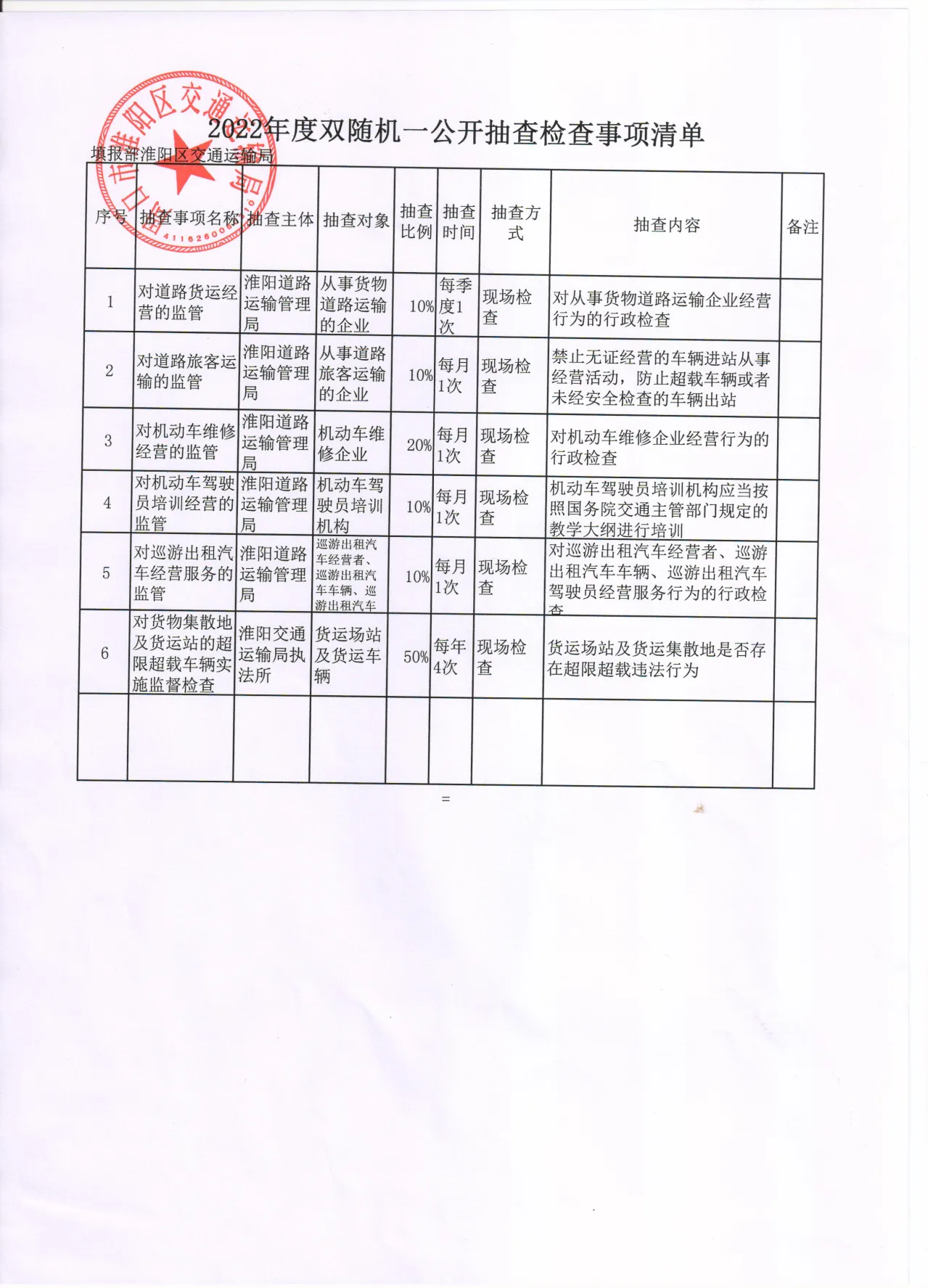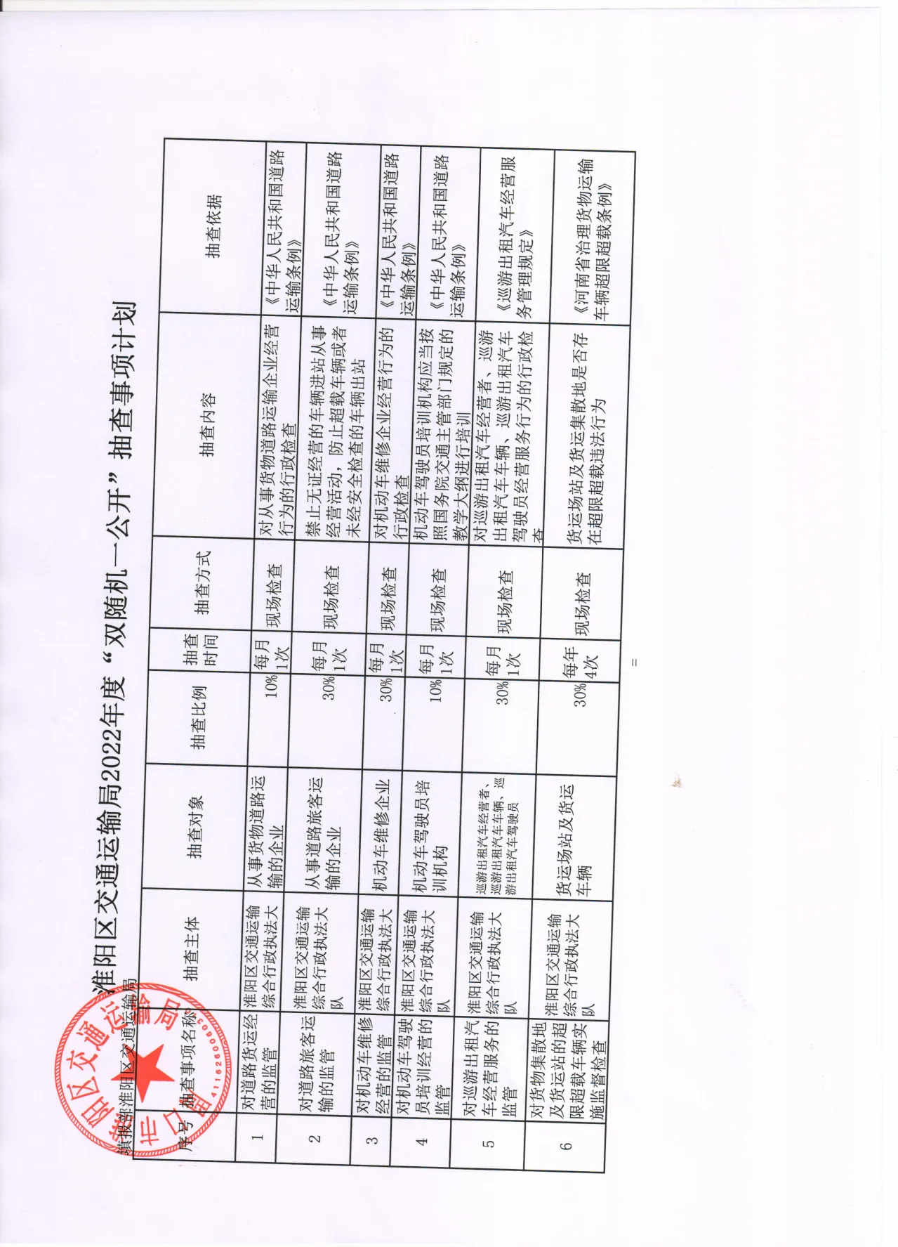 为统筹做好2022年度“双随机、一公开”抽查检查工作,我局编制了《淮阳区交通运输局2022年度“双随机、一公开”抽查事项计划》《淮阳区交通运输局2022年度“双随机、一公开”抽查事项清单》,现印发给你们,请认真落实好2022年度“双随机、一公开”抽查工作。