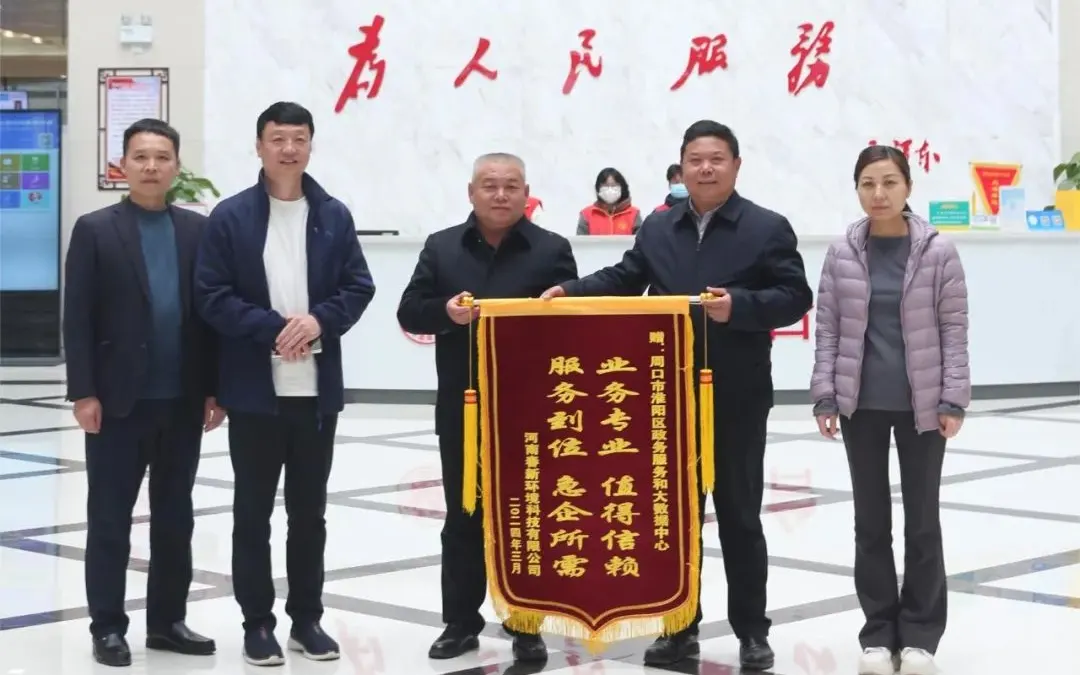 “真是太感谢你们了,帮我们解决了发展难题!”2024年3月26日下午,河南春新环境科技有限公司向淮阳区政务服务和大数据中心送上了一面锦旗,以表达对其出色服务的感激之情。锦旗上写着:“业务专业,值得信赖,服务到位,急企所需”,充分体现了该公司对政务服务和大数据中心的高度认可和赞赏。