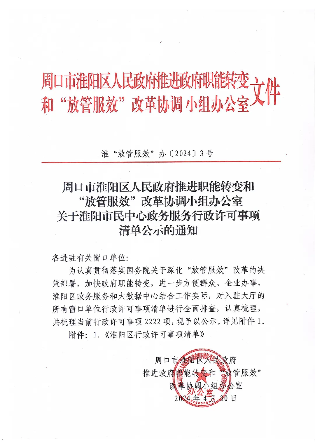 周口市淮阳区人民政府推进职能转变和“放管服效”改革协调小组办公室关于淮阳市民中心政务服务行政许可事项清单公示的通知