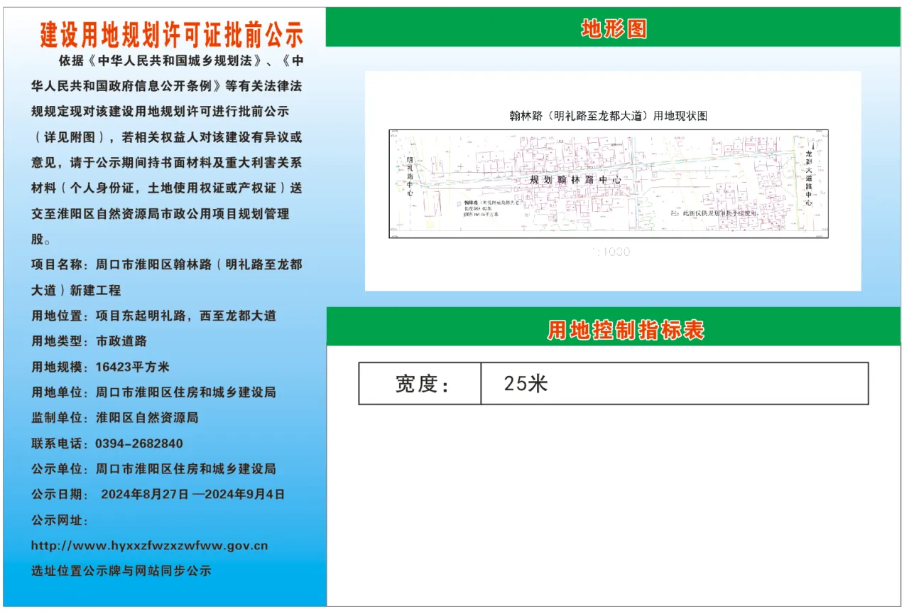 建设用地规划许可证批前公示周口市淮阳区翰林路(明礼路至龙都大道)新建工程