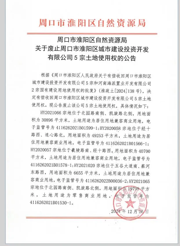周口市淮阳区自然资源局关于废止土地使用权的公告